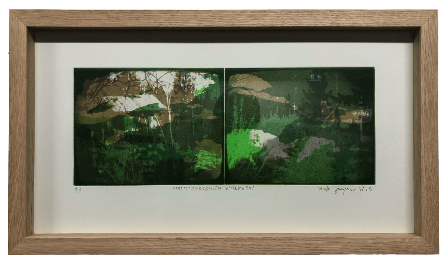 Heliogravyyri, uniikkivedos. Tammikehys. Kuvan koko: 14 x 36 cm.