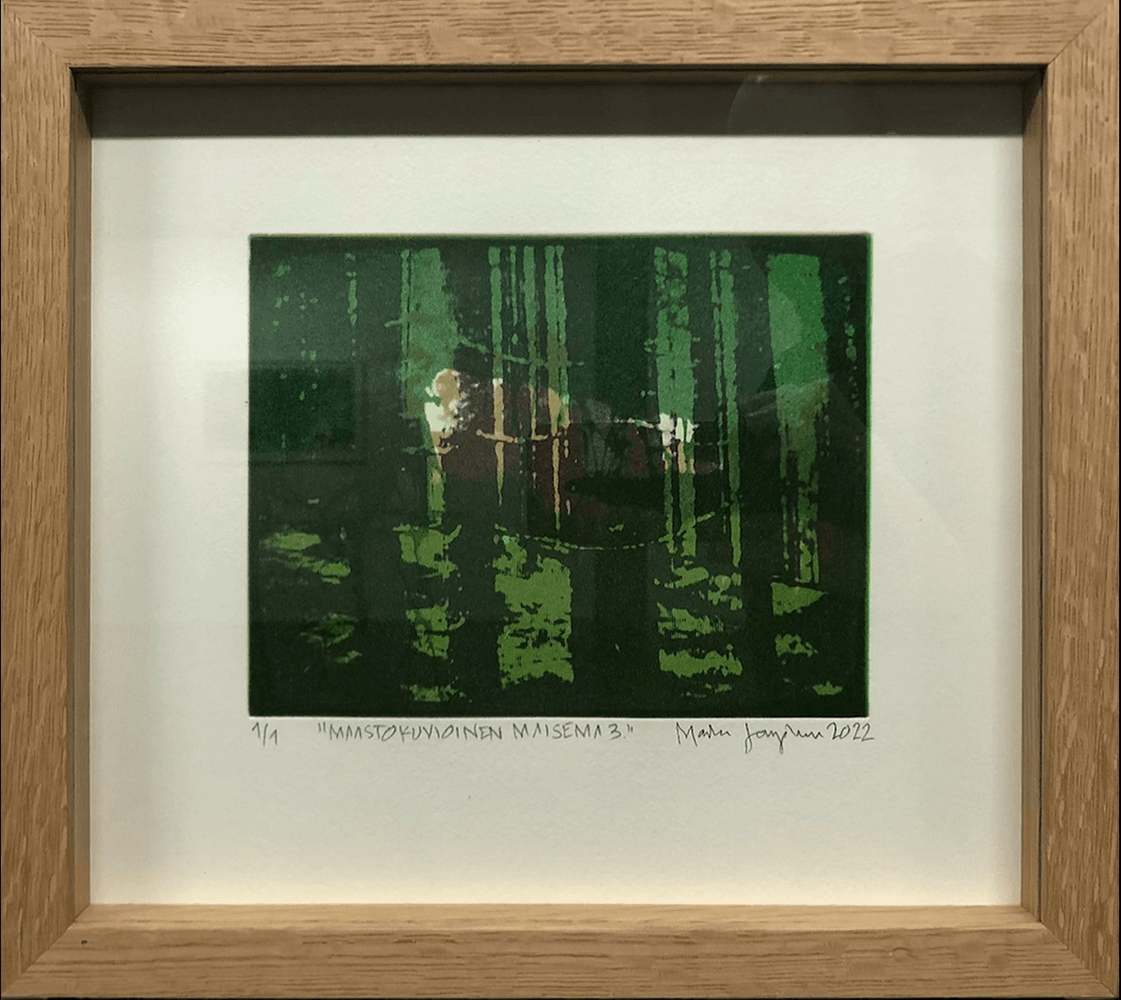 Heliogravyyri, uniikkivedos. Tammikehys. Kuvan koko: 14 x 18 cm.